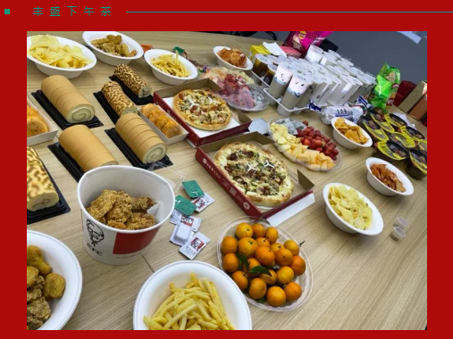 行政中心的小姐姐為大家準(zhǔn)備了水果盤、糕點(diǎn)、披薩、奶茶、炸雞薯?xiàng)l等小吃。
