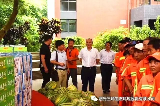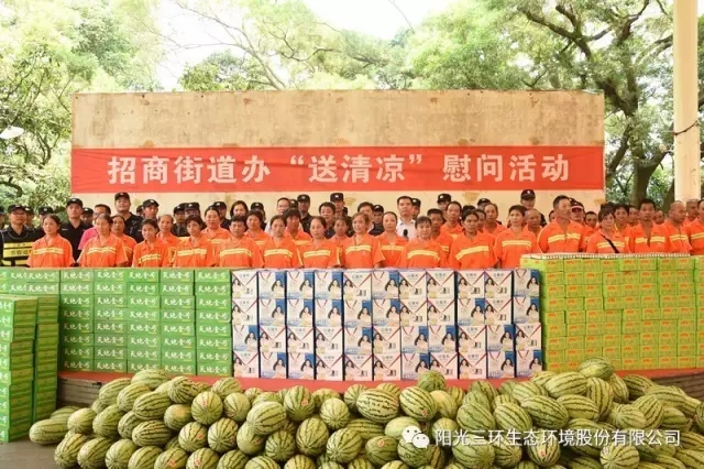 8月22日,招商街道辦朱副書記、黃輝大隊長親自帶隊,慰問轄區300余名環衛工人、100余名協管員,發放王老吉、天地一號涼茶、牛奶、西瓜、風油精防暑降溫五件套,為奮戰在一線的員工帶去一份“清涼”的問候。公司總裁盧秀慶、常務副總裁和慧、副總裁陳照宣參與此次活動。