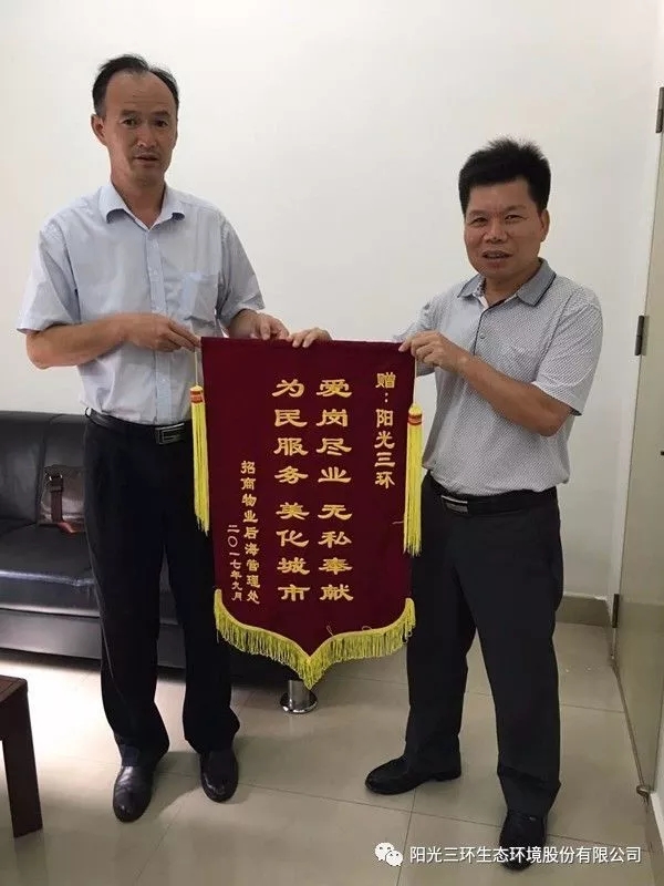 10月9日,公司后海片區物業清潔管理項目喜獲招商物業后海管理處表彰,授予錦旗:“愛崗敬業、無私奉獻、為民服務、美化城市”,簡短的16個字是對后海片區項目部全體員工工作成績的肯定。公司副總裁陳照宣出席了授旗儀式。