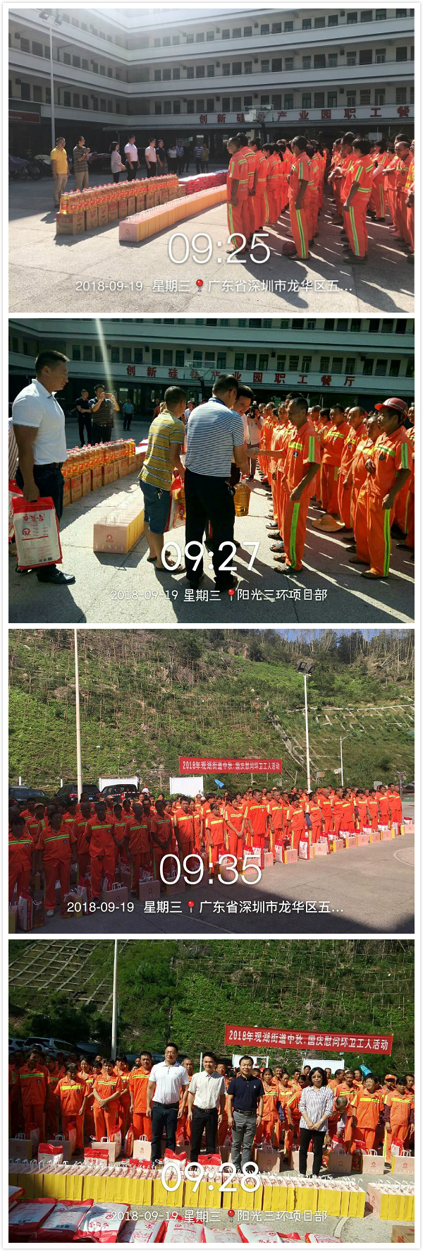 觀湖街道辦曾書記、姜副主任 、洪濤委員,市政服務中心曾主任、黃部長以及公司常務副總裁和慧女士在中秋佳節前夕,去到觀湖項目部給一線環衛清潔工人們送去糧、油、月餅,提前給環衛工人們送去節日的祝福與問候,祝福環衛工人們闔家團圓!中秋快樂!