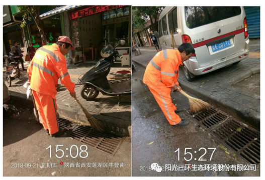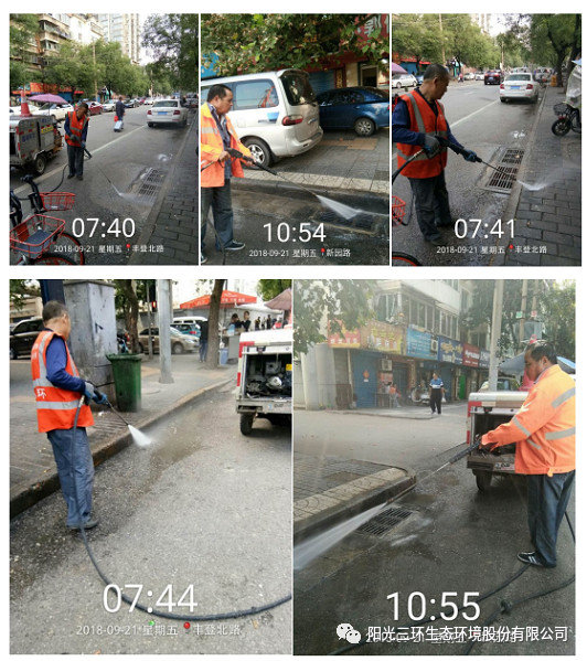 人機結合,組織保潔員清掃衛生死角,使用高壓水槍沖洗下水井口油污,確保道路見本色。
