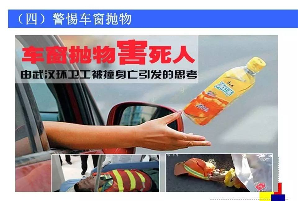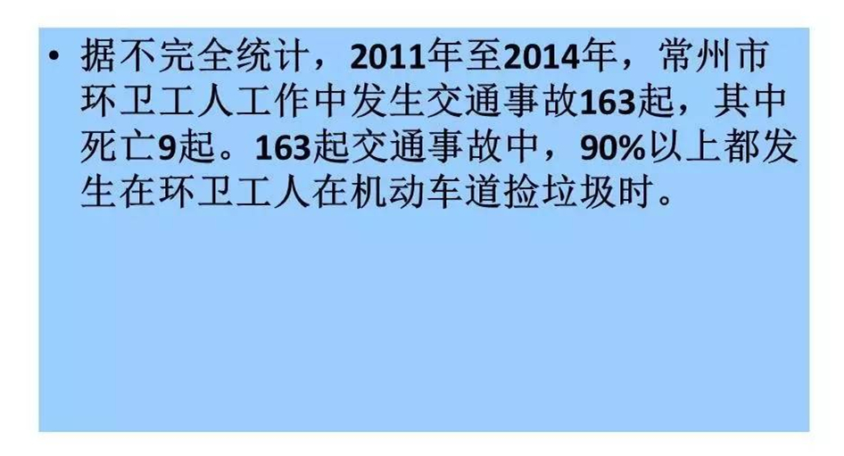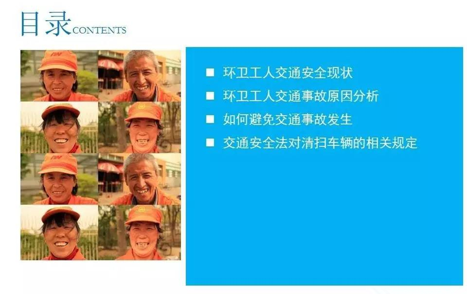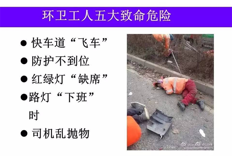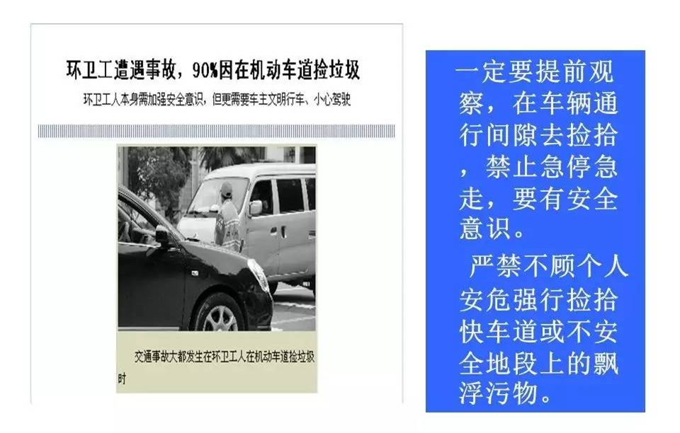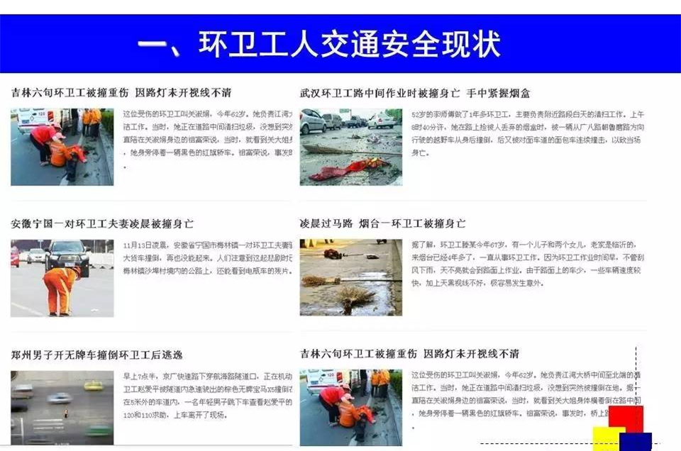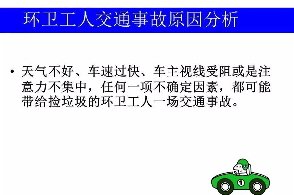 道路就是環衛工人的工作崗位,交通事故每天每時每刻都在威脅著他們的人身安全。今天我們共享一個環衛工人交通安全講座的PPT,一要提高環衛工人的安全防范意識,二要讓每一位市民,都遵守交通規則,不車窗拋物。一定可以大大減少無謂的犧牲。