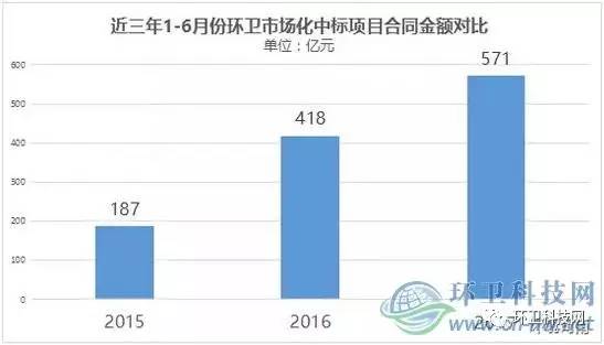 2015年之前,環衛市場化進程相對比較平靜。進入2016年,環衛市場化呈現出跳躍式增長態勢,合同金額同比(與2015年相對)增幅高達223%。2017年我國的環衛市場化延續了2016年的強勁走勢,截止1-6月份合同金額接近600億元,全年將輕松跳過1000億元關口。