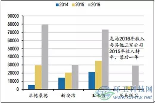2015年龍馬環(huán)衛(wèi)服務(wù)收入僅3633萬(wàn)元,其他三家公司2014年平均收入1.38億,兩者相差接近1億。再向后各推移一年,2016龍馬該板塊營(yíng)業(yè)收入2.92億,而其他三家公司2015年的平均收入為2.84億。可以看出,目前龍馬收入落后其他公司約1年之久。考慮到玉禾田是以傳統(tǒng)物業(yè)保潔業(yè)務(wù)起家,創(chuàng)立時(shí)間均超過(guò)10年,從業(yè)經(jīng)驗(yàn)豐富、客戶(hù)資源充足,具備先發(fā)優(yōu)勢(shì)。而龍馬則是2015年開(kāi)始提出“設(shè)備+服務(wù)”雙輪驅(qū)動(dòng)戰(zhàn)略,起步稍晚,但憑借設(shè)備領(lǐng)域的優(yōu)勢(shì),迅速縮短了與傳統(tǒng)優(yōu)勢(shì)企業(yè)的差距。