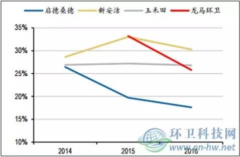 從毛利率來(lái)看,龍馬2016年毛利率為25.77%,相比15年下降7.46個(gè)百分點(diǎn),而啟迪桑德的2016年毛利率17.61%,相比2015年前也下降了2.11個(gè)百分點(diǎn),這主要由于中標(biāo)環(huán)衛(wèi)產(chǎn)業(yè)服務(wù)項(xiàng)目增加,而新增項(xiàng)目多處于磨合期,導(dǎo)致總體成本上升。相比之下,傳統(tǒng)環(huán)衛(wèi)公司從業(yè)經(jīng)驗(yàn)豐富,具備更強(qiáng)的成本控制能力,毛利率基本穩(wěn)定在27%-30%,波動(dòng)范圍稍窄。