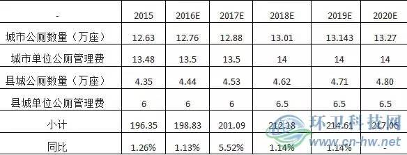 目前,我國(guó)一、二線(xiàn)平均清掃價(jià)格在10-12元/平方/年左右,垃圾清運(yùn)價(jià)格在70-80元/噸,而公廁的年運(yùn)營(yíng)費(fèi)用在12萬(wàn)/座左右。我們以全國(guó)代表性項(xiàng)目海口市龍華區(qū)環(huán)衛(wèi)一體化PPP項(xiàng)目的單價(jià)為標(biāo)準(zhǔn),其一級(jí)道路清掃保潔單價(jià)為10.25元/平米·年、垃圾清理74.22元/噸·年,公廁運(yùn)營(yíng)管理13.48萬(wàn)元/座·年,而縣城價(jià)格不到城市維護(hù)單價(jià)的一半,縣城的上述三項(xiàng)單價(jià)我們分別取5元/平米·年、35元/噸·年、6萬(wàn)元/座·年。根據(jù)《2015年中國(guó)城鄉(xiāng)建設(shè)統(tǒng)計(jì)年鑒》披露的中國(guó)城鄉(xiāng)清掃面積、垃圾清理及公廁數(shù)量,可以計(jì)算出2015年我國(guó)環(huán)衛(wèi)市場(chǎng)空間大致為1205億元。