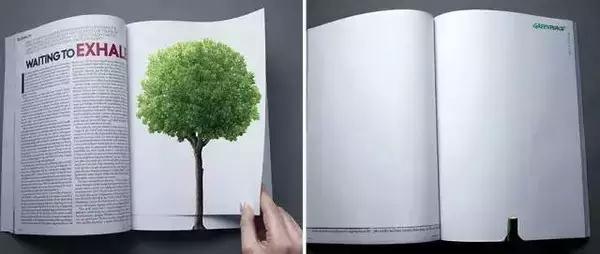廣告詞:With Every Turn of A Page, Deforestation Continues. 每翻一頁,就有一棵樹從地球上消失。