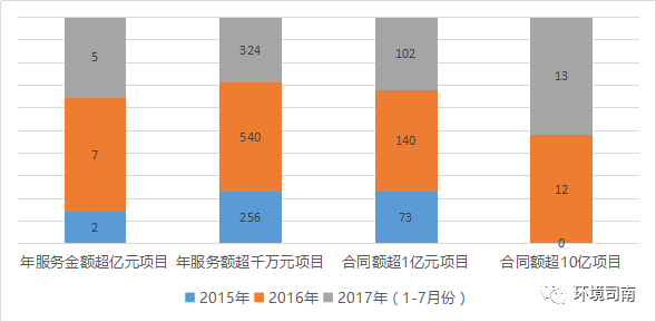 2016年合同金額超10億元的新簽環(huán)衛(wèi)項(xiàng)目為12個(gè),2017年1-7月份合同金額超10億元的新簽環(huán)衛(wèi)項(xiàng)目為11個(gè),而2015年此類(lèi)項(xiàng)目為零。