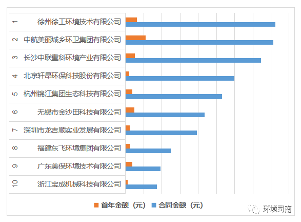 其中:“徐州徐工環境技術有限公司、中航美麗城鄉環衛集團有限公司、長沙中聯重科環境產業有限公司、杭州錦江集團生態科技有限公司、深圳市龍吉順實業發展有限公司”等10家公司共中標17個項目,合同總金額49.53億元,中標項目首年服務費總金額4.34億元。