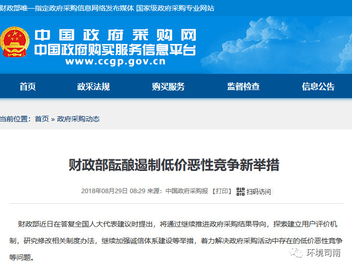 財政部今年8月份在答復全國人大代表建議時提出,將通過繼續推進政府采購結果導向,探索建立用戶評價機制,研究修改相關制度辦法,繼續加強誠信體系建設等舉措,著力解決政府采購活動中存在的低價惡性競爭等問題。